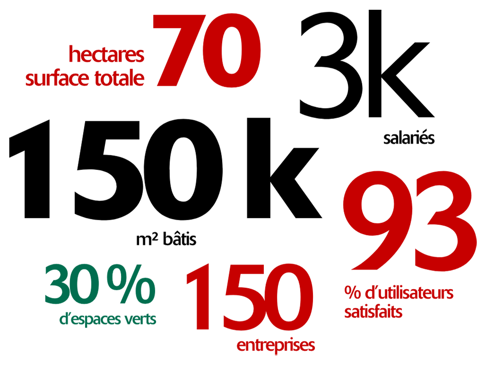 - 70 hectares, 150,000 m² of built areas; 40% green spaces