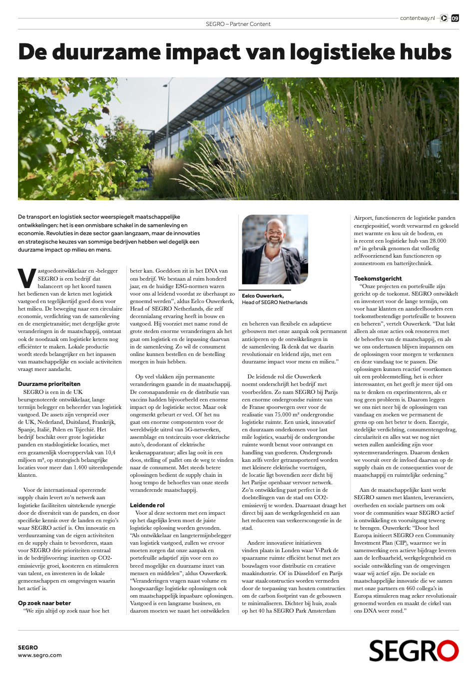 Op vrijdag 5 juli in het Financieel Dagblad: in de thema-bijlage Digitalisering & Supply Chain een interview met Eelco Ouwerkerk, Head of SEGRO Netherlands. Over hoe SEGRO de toekomst van de logistieke supply chain vormgeeft met innovatieve vastgoedoplossingen. Over hoe we ons inzetten voor een efficiëntere en groenere logistieke wereld. En meer.